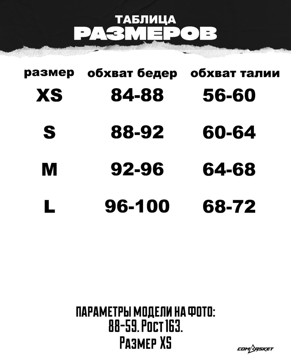 XS — обхват бедер 84-88; обхват талии 56-60.
